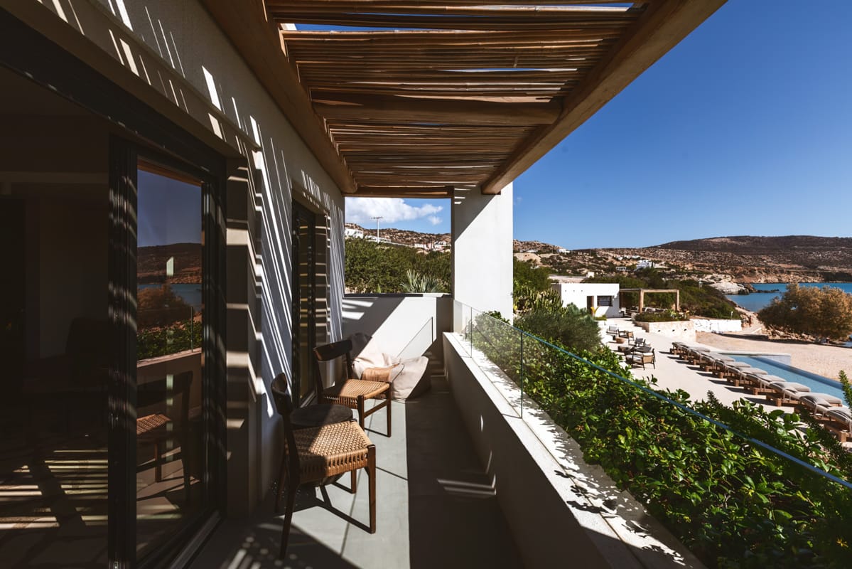 The upper-level suites range from 20 to 30 sqm and enjoy the privilege of the property’s unique location, offering breathtaking views of the turquoise waters of the Karpathian Sea.